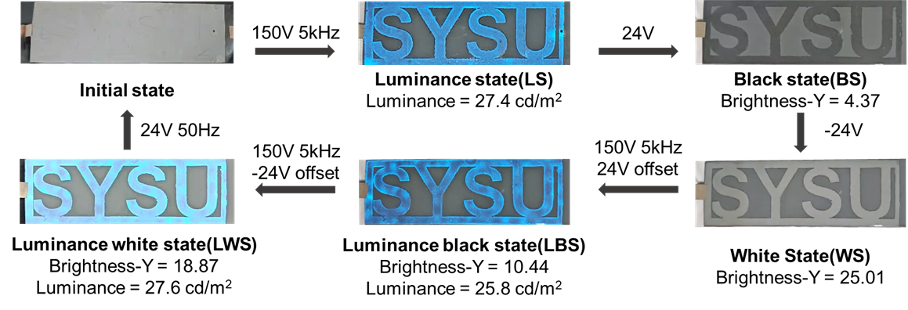 电泳式电子纸是目前应用最为广泛的反射式显示器件之一,其独特的双稳态(Bistability)特性令其无需持续供电便能保持图案和信息的显示,这使得电泳式电子纸具有极低的能耗,已广泛应用于公交站牌、指示牌和商场价签等场景。然而如何使电泳式电子纸在弱光环境下依旧保持良好显示效果的相关研究较少。研究团队研发的集成交流电致发光技术电子纸通过将电泳式微胶囊与交流电致发光粉末均匀掺杂于水性聚氨酯(WPU)材料中,基于两种显示材料的驱动信号不同,可以在同一显示器件中实现反射模式和发射模式的简单切换,兼具良好显示效果。(图2)