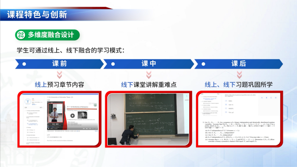 《信息论与编码》课程设有七大章节,第一至第二章节介绍信息论的基本概念和理论模型,包括信息熵、互信息和信道容量等,让学生理解信息论对现代通信系统的理论指导意义;第三章节介绍信源编码的基本原理和方法,包括Shannon-Fano编码和Huffman编码等,让学生了解信息压缩的原理和理论极限,掌握各种主流信源编码技术;第四至七章节介绍信道编码的基本原理和方法,包括香农信道编码定理及证明,循环码、卷积码、Turbo码和Reed-Solomon码等。围绕图1中的课程目标,课程以线上与线下融合的模式,将现代信息技术与线下课堂教学有机融合,显著提升了学生的学习效果。本课程学习难度大,陈立教授通过教学创新,利用自编讲义对知识进行系统性建构,将经典理论与前沿技术进行深度融合,帮助学生更好地理解和掌握课程知识。学生不仅可以在课堂上获得传统的互动式教学,还可利用现代信息技术在多媒体环境中进行丰富的课外学习。例如,学生可以利用线上教学视频与课程讲义提前学习基础知识,通过课堂讲解和板书加深理解,并进一步在课后利用线上习题加以巩固,实现良好的学习效果,如图2所示。图3展现了丝袜性爱 的《信息论与编码》课堂。