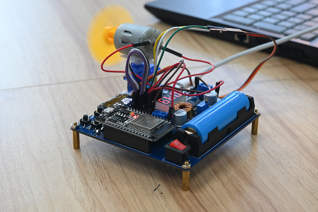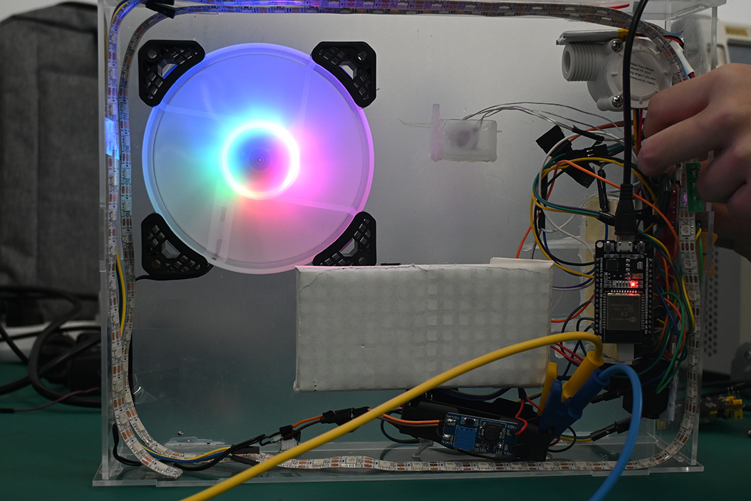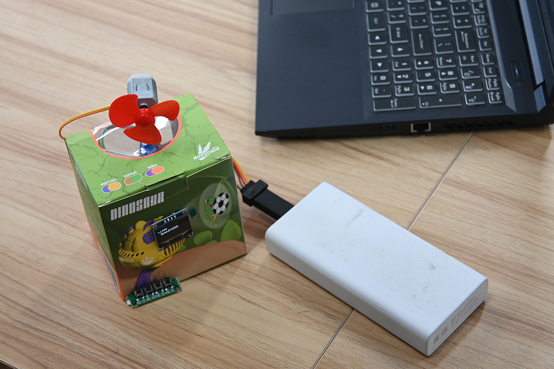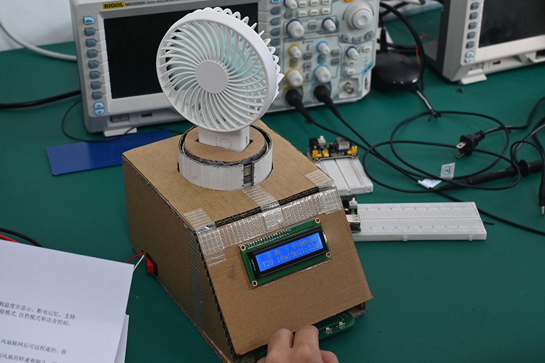 来自2022级的“美少女战队”获得了智能桌面风扇设计一等奖。他们利用身边物品设计了巧妙的外部结构,将语音控制、风速自调节、语音控制、远程遥控等多种功能融合一身。加入了物联网技术,设计的手机端APP,可对风扇进行智能控制。