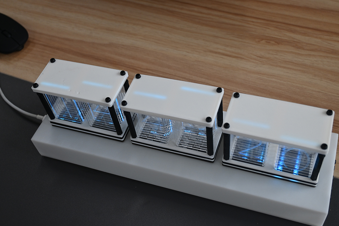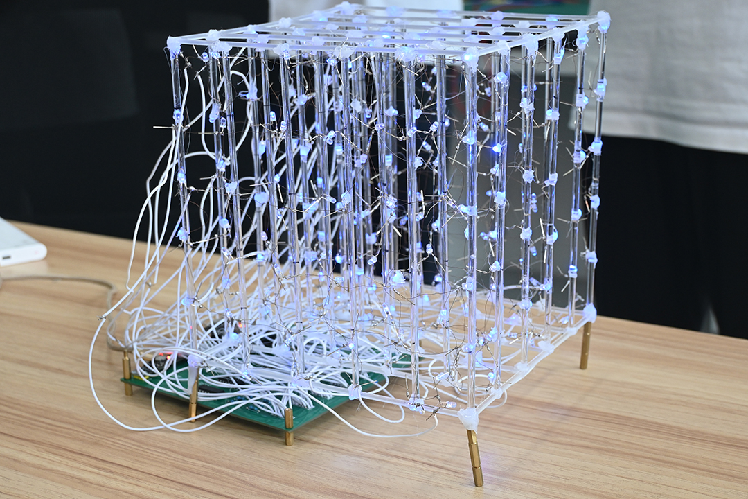 来自2022级的“完赛就算成功”获得了LED灯光秀一等奖。该作品硬件电路以及外壳均为自主设计制作,通过WIFI联网实现实时时间显示,效果酷炫。